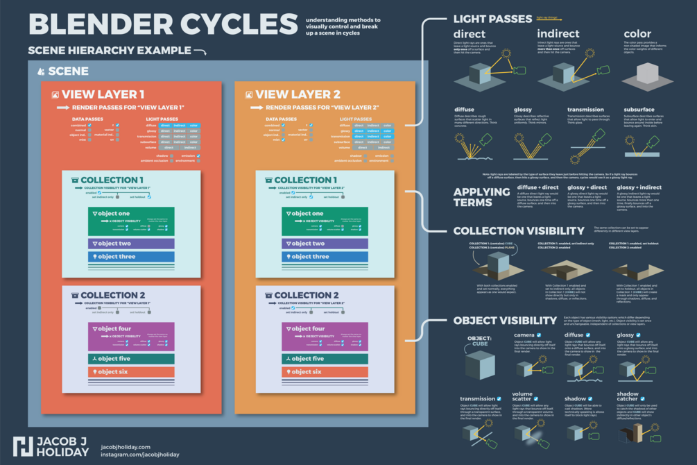 I struggled for a long time to understand the different ways that Blender Cycles allows you to control what/how things show up in renders. It's still tricky to understand as there are so many different combinations of visibility settings! But it's important and has been really helpful for me to dig in and try to understand it all, especially for combining CGI with real footage. Hopefully this guide is helpful and if you have any feedback/corrections/changes please let me know!